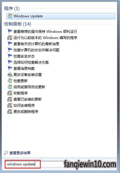 1、点击开始菜单,在搜索框中输入:windows update 按下回车键打开 Windows 更新;