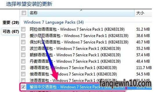 3、打开“选择希望安装的更新”界面,在左侧点击【可选】,在右侧找到【繁体中文语言包】 - Windows 7 Services Pack1 (KB2483139)勾选起来选中后点击确定;