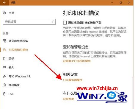 第二步、在设备窗口,打开切换到“打印机和扫描仪”选项卡,在右侧窗口中找到并打开“打印机服务属性”;